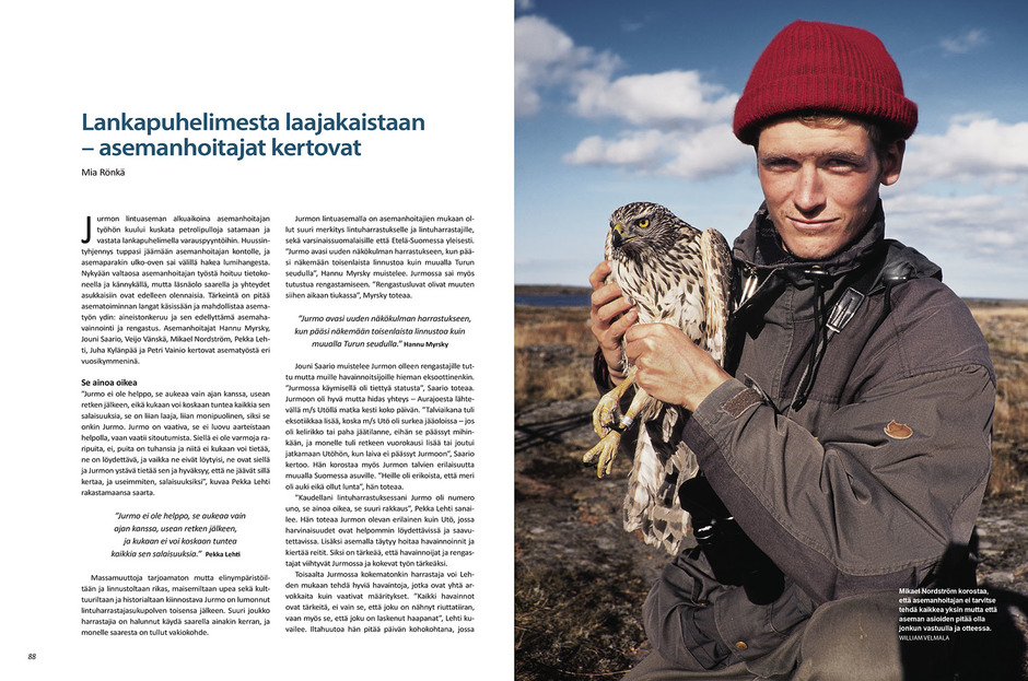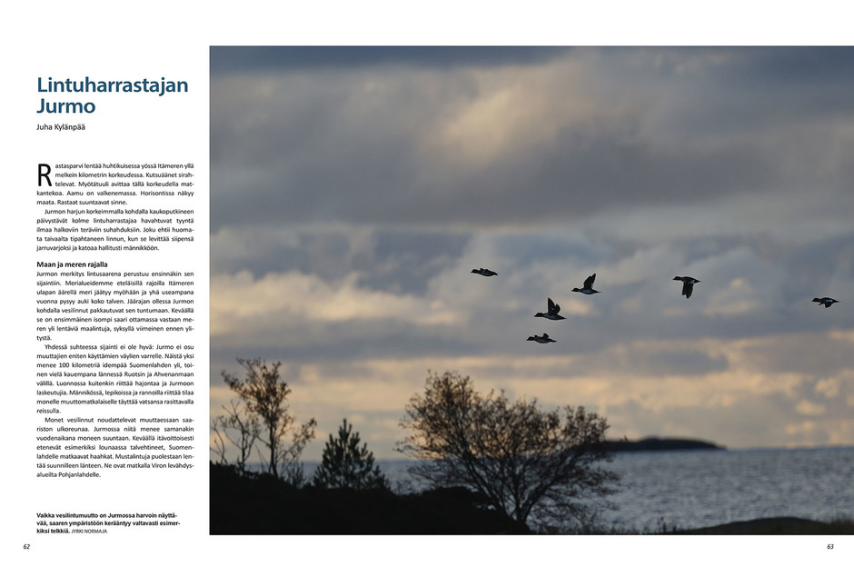 Upeiden Jurmossa kuvattujen lintu- ja luontokuvien sävyttämä kirja on kunnianosoitus kaikille asemalla aikojen saatossa vapaaehtoisesti havainnoineille ja kiitos aseman toimintaa eri tavoin tukeneille. Toisaalta kirjaa lukemalla voi tutustua linnustoon ja eri lajeja uhkaaviin tekijöihin yleiselläkin tasolla. Vaikka kirja paljastaa uutta tietoa jopa lintuammattilaiselle, löytyy siitä runsaasti luettavaa kenelle tahansa saariston luonnosta kiinnostuneelle. Kirja on erinomainen joululahjaidea kenelle tahansa Jurmossa viihtyvälle luontoharrastajalle.