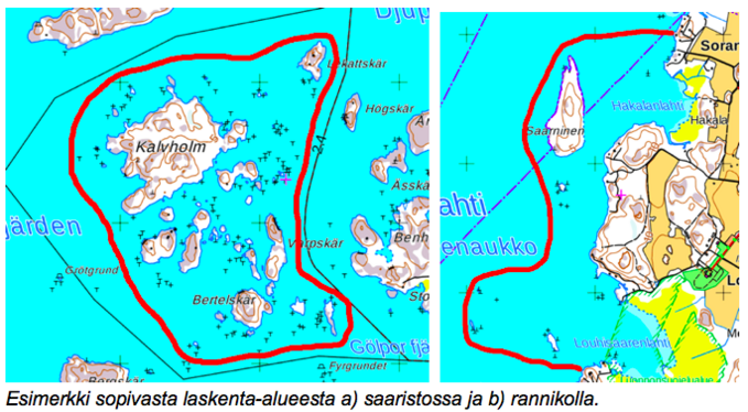 - Esimerkki kahdesta sopivasti rajatusta laskenta-alueesta on esitetty oheisissa kuvissa. Huomaa vasemmassa kuvassa sopiva koko (noin 20 saarta ja luotoa, alueen koko noin 2 x 3 km) ja tarpeeksi suuret etäisyydet seuraaviin saariin sekä oikeassa kuvassa rannikolla tehdyn kartoituksen merkintä niin, että kartoitettu osa rantaviivasta tulee selville rajauksesta.