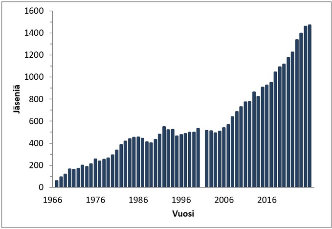 Koko Varsinais-Suomen alueella toimiva Turun Lintutieteellinen Yhdistys TLY on Suomen kolmanneksi suurin lintuyhdistys, ja se on yksi BirdLife Suomi ry:n 29 paikallisyhdistyksestä. Kuvassa näkyy TLY:n jäsenmäärän kehitys yhdistyksen perustamisvuodesta lähtien.